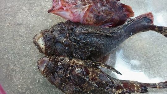 今日はM師匠と海へ、私、初めてのポイントです。慣れてない場所、やや浅瀬で潜っていると、早速見つけたのがオニオコゼ。(^^;) 突くのは簡単ですが、背びれに強い毒があるので、刺されないように慎重にヤスから外して取り込みます。さらにもう1匹、30㎝近い大物です。魚以外にも海の幸、いっぱいいただきました。オニオコゼは、背びれをハサミで切って捌いて、唐揚げとお汁でおいしくいただきました。(^.^)