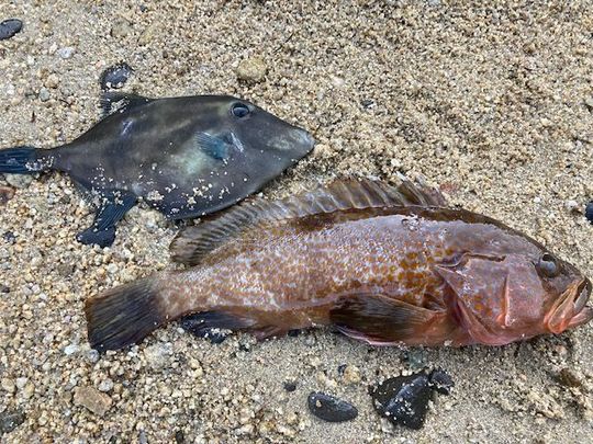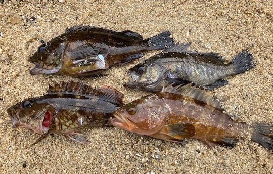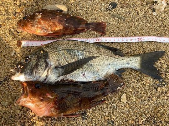 今日は敬老の日。魚を突けたら妻の両親に持っていくと言って海へ。(^^)v 今日は凪、でも透明度はいまいち。いきなりチヌが近づいてきたので突いたのに…痩せてる。(-.-) アコウを突きたかったのに、突けず、カサゴが2匹。1時間ちょっと泳いで4時過ぎ、急に夕方の波が出てきて視界0どころか、波にさらわれて胸から岩にぶつかるような危険な状態に。急いで上がって終了。何が起こるかわからないのが自然です。^_^