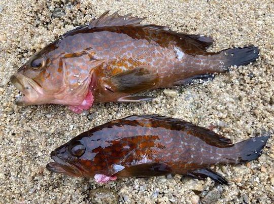 今日は、早朝から海へ魚突きに。GW中に一度来たのですが、釣り人らがいたのと、波もあったので諦めたのでした。今日の波は凪、時々雨が降ってくれる(雨の方が喉が調子いい)絶好の魚突き日和。弱ってるチヌは無視して、アコウを探します。小さいのしかいなかったのですが、何とかゲット。メバルやソイもゲットして帰宅。今年も楽しい季節がやってきました。(^^)/