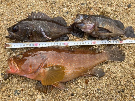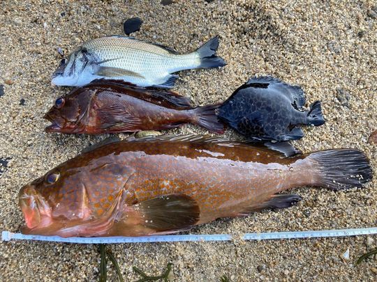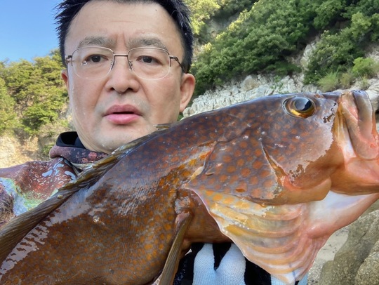 今日は敬老の日。写真等載せていませんが、お盆中も2回ほど潜ってまして…今日の干潮は午前中でしたので、早朝に出発して、1ケ月ぶりに海へ魚突きに。少し波がありますが、透明度は問題なし。ポイントに着くといきなりイシガキダイが現れて、食べたことなかったので小さいですがどうしても食べてみたくてget。今日もアコウ目指して探していると…岩の隙間の奥からこちらを窺ってる良型のアコウを発見。アコウって、こっち向いてる状態から左に回転して逃げていくことの方が多い、ってことに最近になって気が付きまして(自論です)、正面より少し右に向けて銛を離すと…手ごたえあり!もう一度押し込んで穴から出すと、45㎝良型のアコウが出てきまして、ラッキー。うれしくて久しぶりに自撮りしました。(^.^)